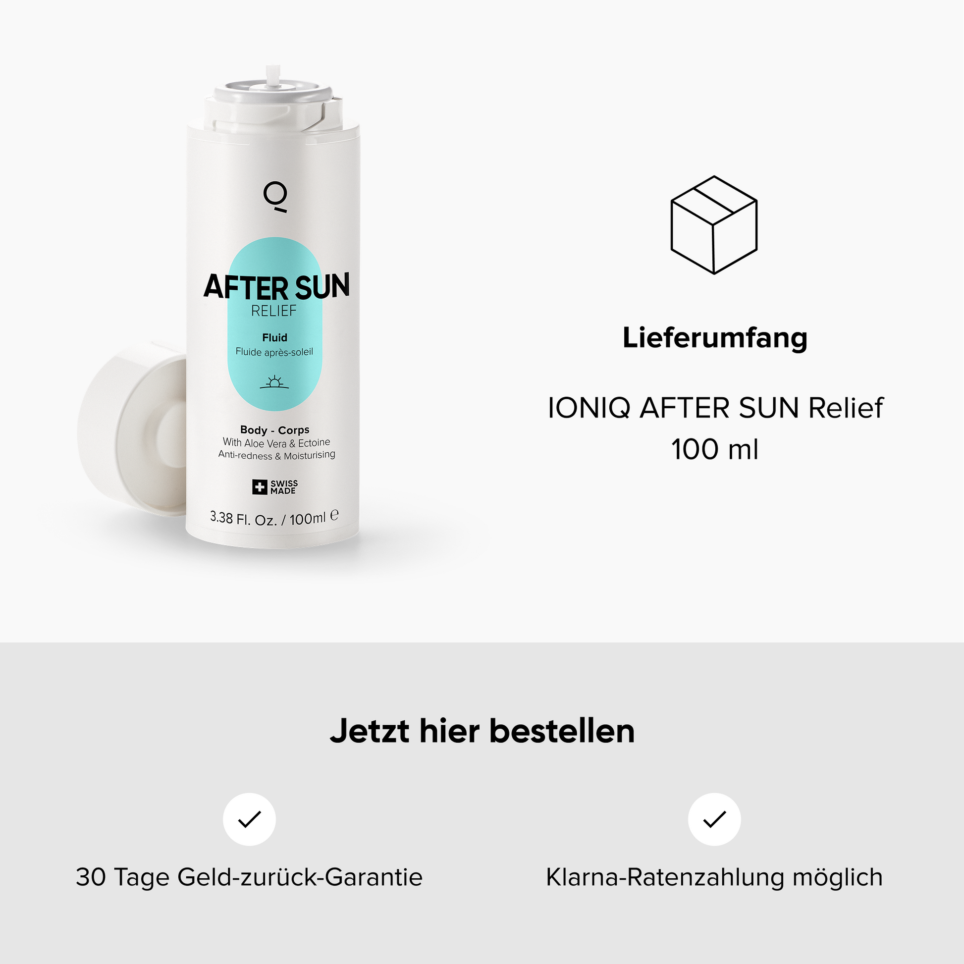 Tagsüber schützt du deine Haut mit IONIQ SUN vor der UV-Strahlung. Am Abend verwendest du IONIQ AFTER SUN, um sonnenverwöhnte Haut zu kühlen, beruhigen und intensiv mit Feuchtigkeit zu versorgen. Unser Tipp: Verwende IONIQ AFTER SUN auch bereits morgens nach dem Duschen – für einen Frischekick und erste Pflege, bevor du in den Tag startest.
