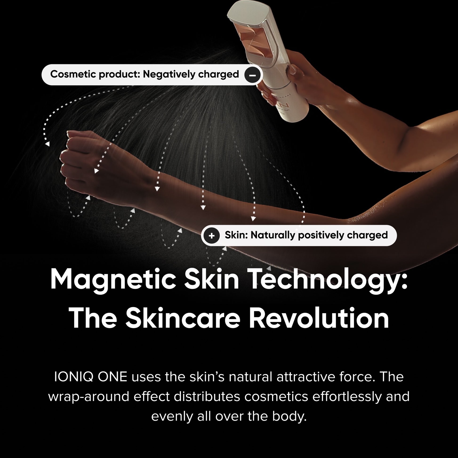 Der IONIQ ONE Sprayer ermöglicht erstmals eine berührungslose Produktanwendung, die deinen gesamten Körper präzise und lückenlos umhüllt. So wird Hautpflege müheloser, schneller, smarter und effizienter. Dank der bahnbrechenden Magnetic Skin Technology sorgt der IONIQ ONE Sprayer für eine nahtlose und gleichmäßige Hautabdeckung. Durch die automatische Dosierung entsteht ein hauchzarter Nebel, der Arme und Beine umhüllt und selbst schwer zugängliche Stellen wie den Rücken zuverlässig bedeckt.