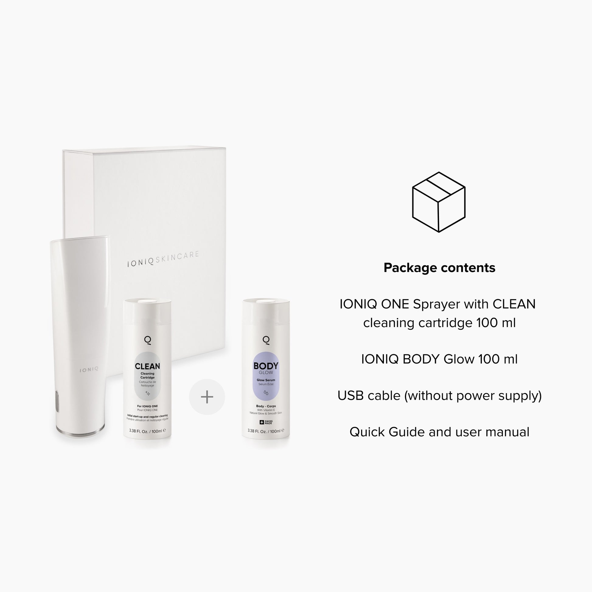 IONIQ ONE Sprayer, Betriebsanleitung, Quick Guide, IONIQ CLEAN Kartusche 100ml, IONIQ GLOW Kartusche 100ml, USB Kabel (ohne Netzteil)