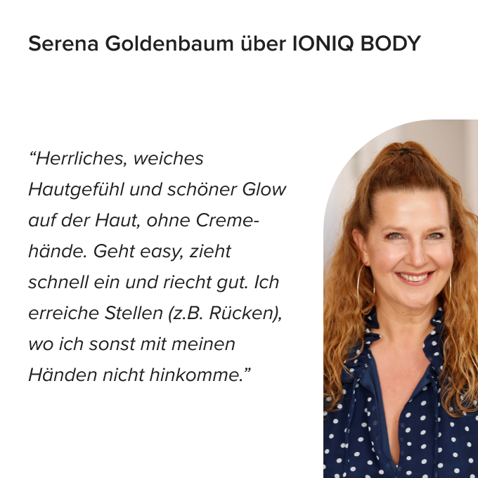 Der gesamte Körper kann in unter einer Minute mit hochwertigen Ölen umhüllt werden. Der angenehme Duft und ein samtiges Hautgefühl runden den Wohlfühlmoment ab. Auch sensible Hauttypen können dieses hochwertige Fluid bedenkenfrei nutzen. Zusätzlich ist IONIQ GLOW – wie alle IONIQ Skincare Produkte – vegan, tierversuchsfrei und in der Schweiz hergestellt.