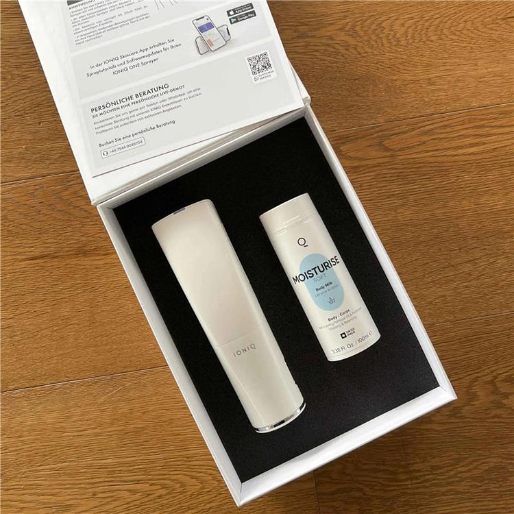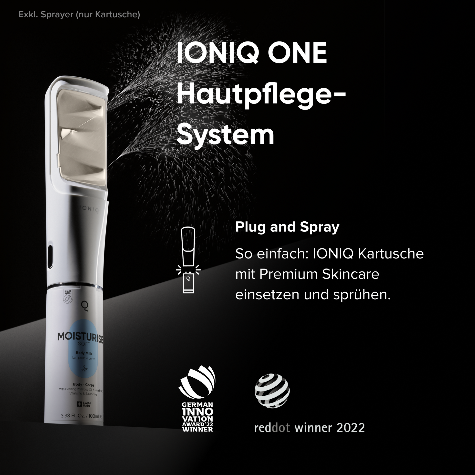 Die Anwendung könnte nicht einfacher sein: Erst schütteln und dann sprühen. Dank der einzigartigen Magnetic Skin Technology und der berührungslosen Anwendung mit dem IONIQ ONE Sprayer wird die Feuchtigkeitspflege optimal auf der Haut verteilt – ganz ohne Verreiben.