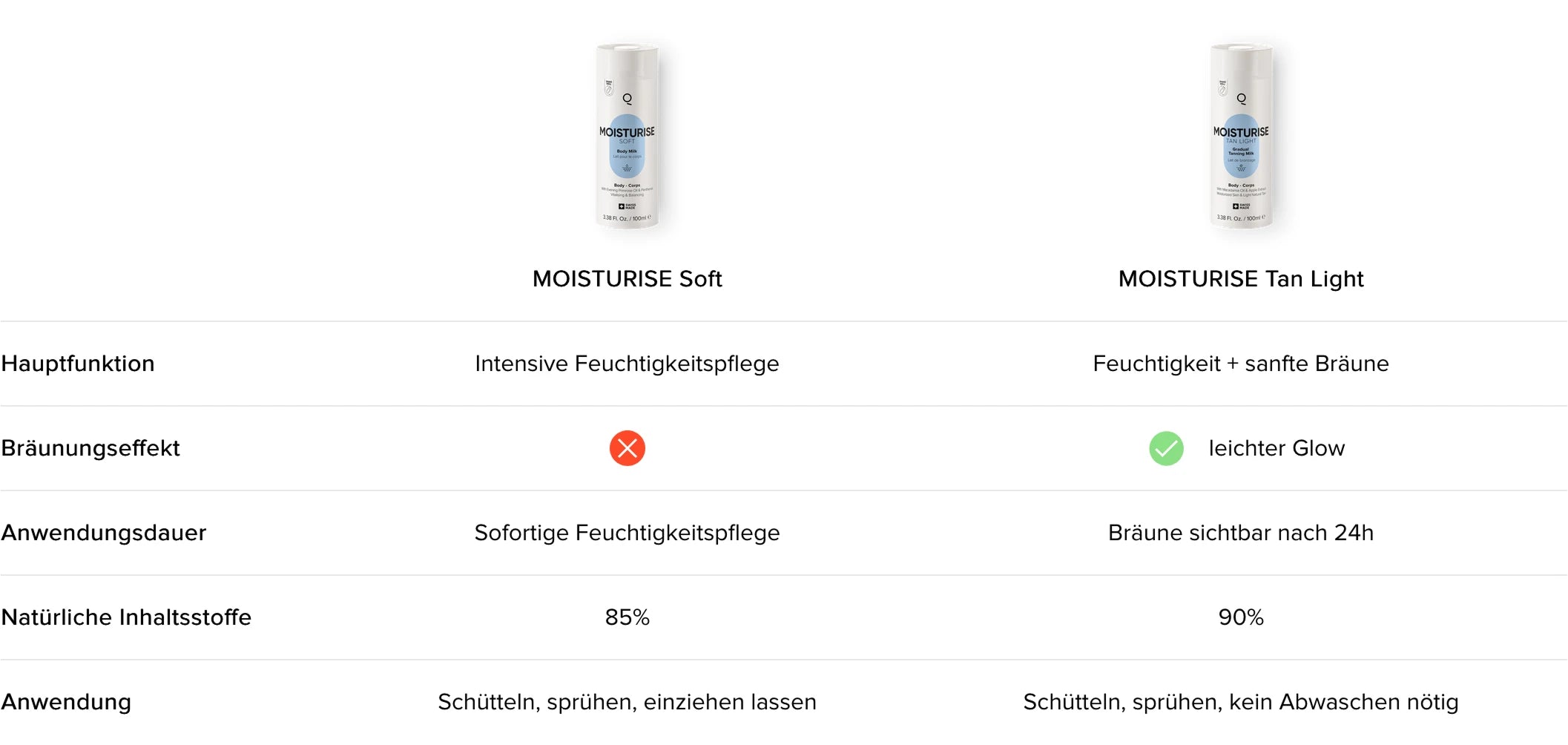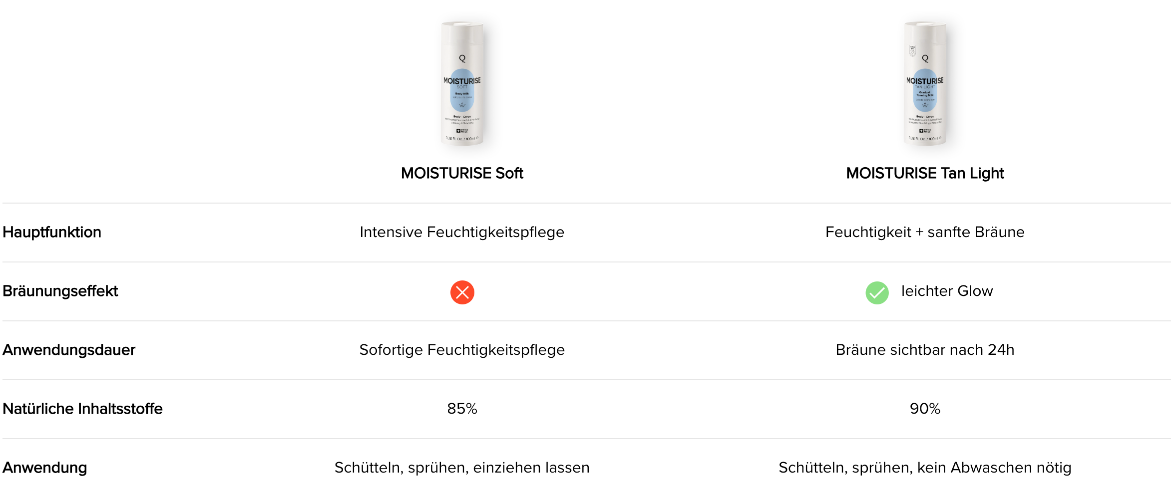 MOISTURISE Soft versorgt die Haut intensiv mit Feuchtigkeit und stärkt die Hautbarriere, während MOISTURISE Tan Light sofortige Feuchtigkeit spendet und eine natürliche, gleichmäßige Bräune aufbaut. Beide Produkte lassen sich nahtlos in jede Skincare-Routine integrieren und bieten eine innovative Lösung für langanhaltende Feuchtigkeit und gesund aussehende Ausstrahlung.