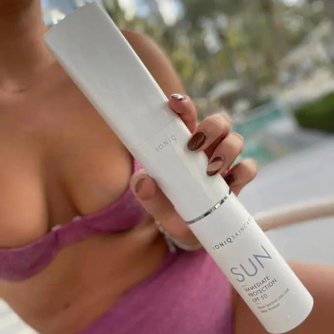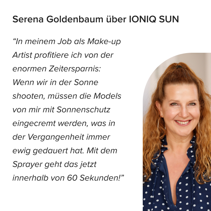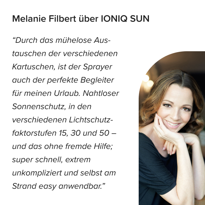 "IONIQ SUN bietet nicht nur einen sehr effizienten Schutz vor UV-Strahlung und deren negativen Auswirkungen, sondern mindert zusätzlich das Voranschreiten der Hautalterung. Ich war begeistert, wie einfach und schnell meine Haut dank des IONIQ ONE Sprayers eingesprüht und geschützt war."