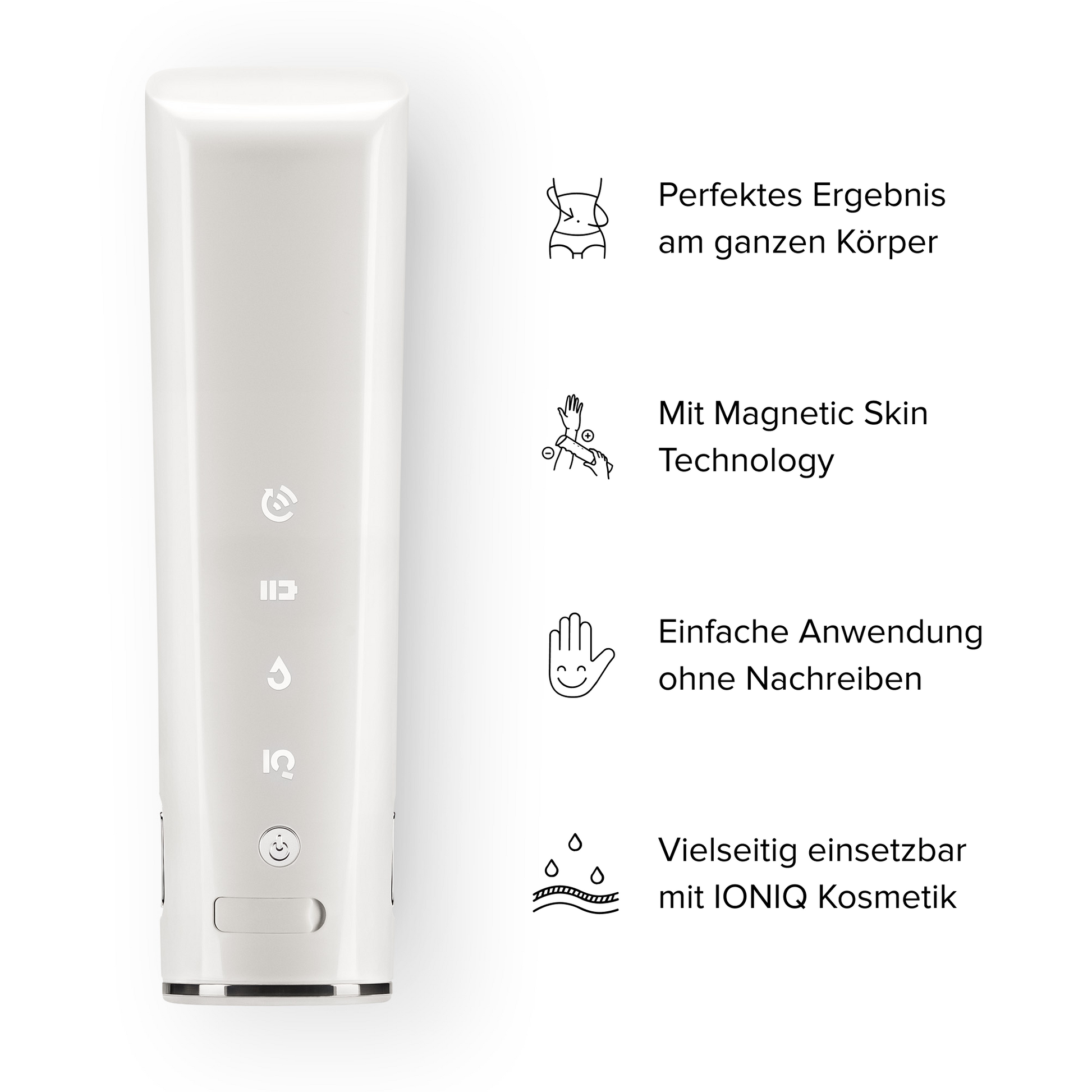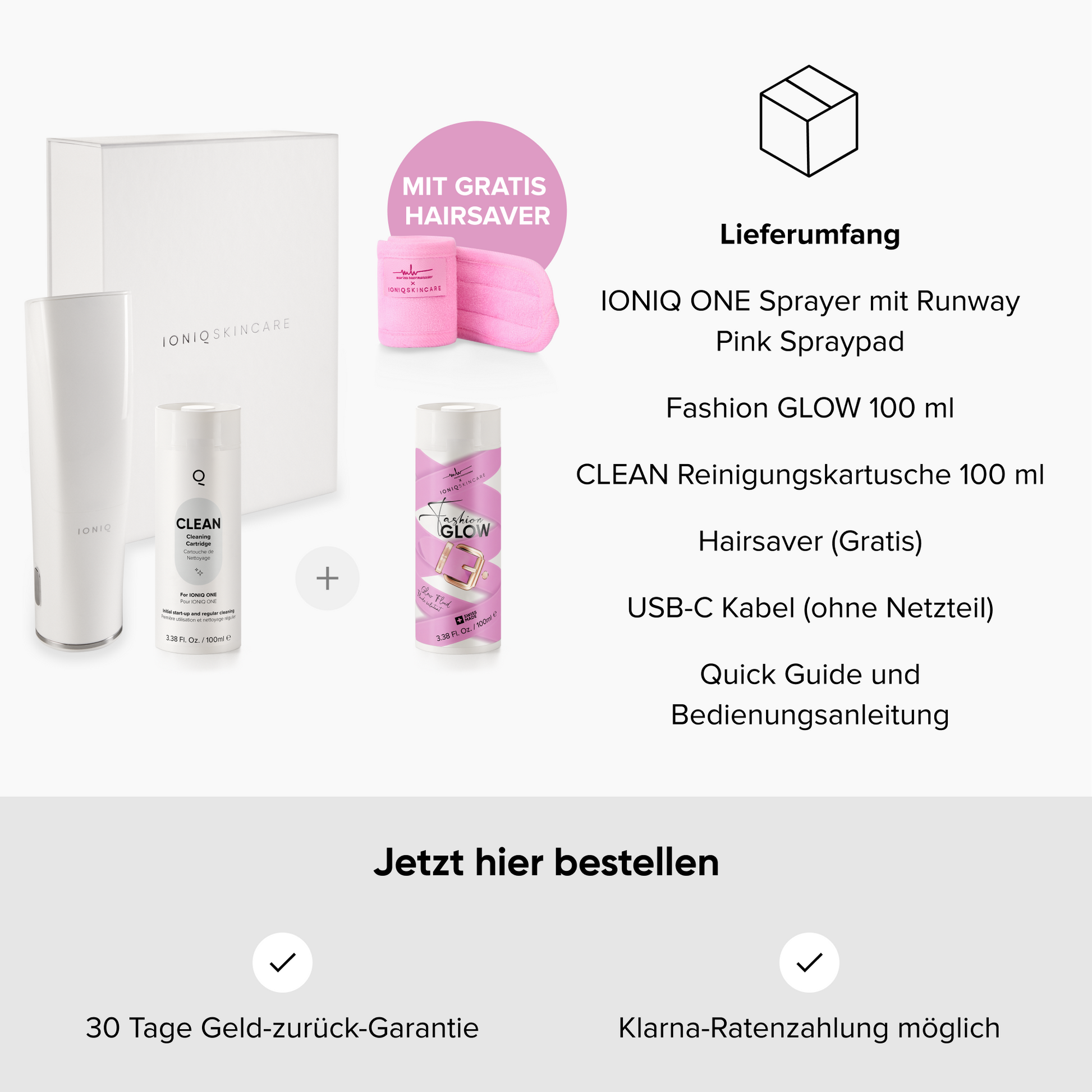 Sprayer: Verwende den IONIQ ONE Sprayer niemals: a) mit einem Herzschrittmacher, b) für Kinder unter 8 Jahren, c) falls du schwanger bist. Mehr Informationen dazu findest du in der Bedienungsanleitung und in den FAQ.