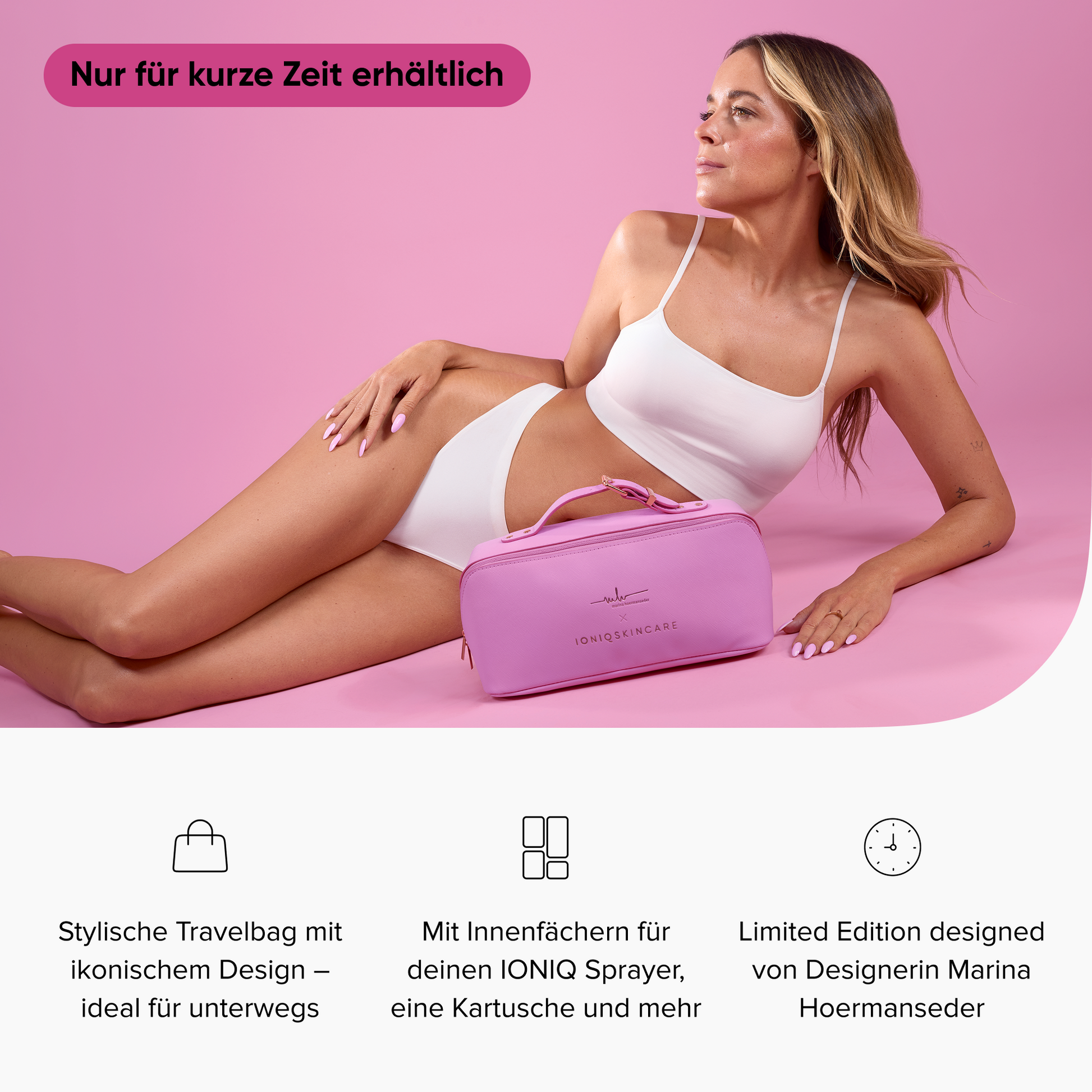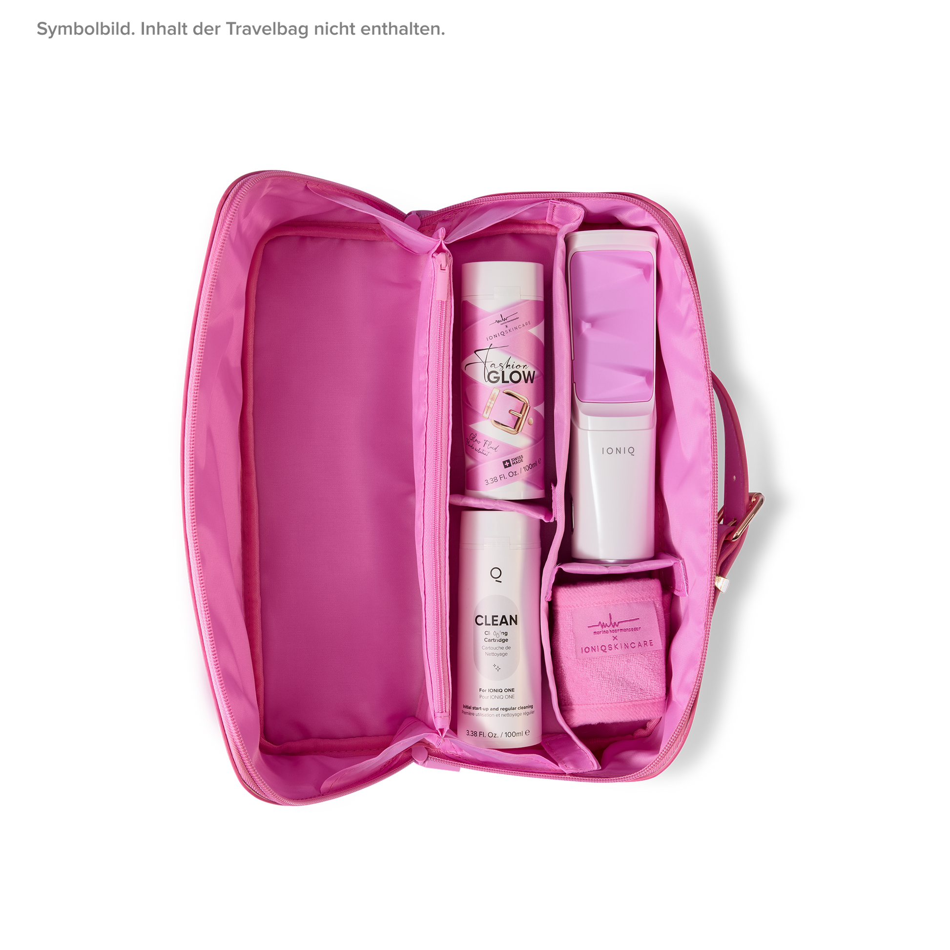 Ja. Die Travelbag verfügt über modulare Trennwände mit Klettverschluss, ein separates Reißverschlussfach für Spraypad oder Ladekabel und großzügigen Stauraum für deine komplette IONIQ Skincare-Routine. Perfekt organisiert – ob zu Hause oder auf Reisen.