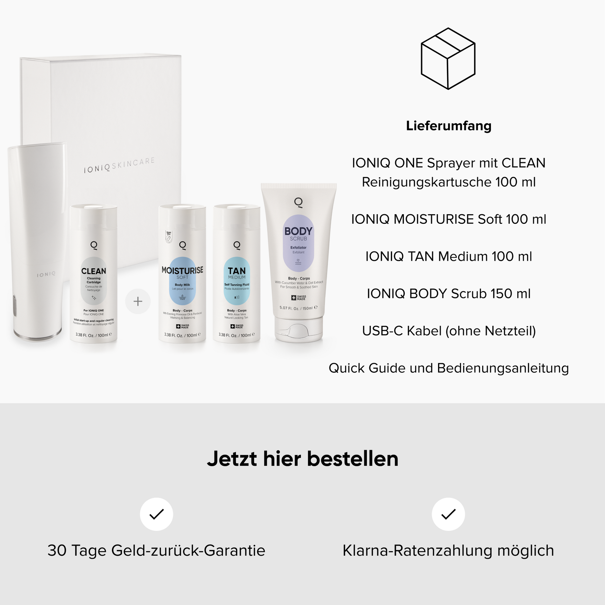 This special tanning bundle is your entry into the world of the most effortless, effective and exclusive tanning routine: Use the IONIQ SCRUB to gently exfoliate and prepare your skin for tanning. For velvety smooth, soothed skin.Tanning: Apply TAN Medium with the IONIQ ONE Sprayer to achieve a long-lasting, natural-looking tan.Nourishing: The next day, moisturise the skin with MOISTURISE Soft and the IONIQ ONE Sprayer. For weightless moisturisation for 24 hours to prolong the tan.the Sprayer is based on Magnetic Skin Technology. This creates a field of attraction between the skin and the skincare product. This means that almost every drop lands on the skin. The wrap-around effect enables homogeneous, complete and streak-free coverage of the skin, even in otherwise inaccessible areas such as the back. The IONIQ Tanning Routine in just 3 steps - quick, easy and effective!