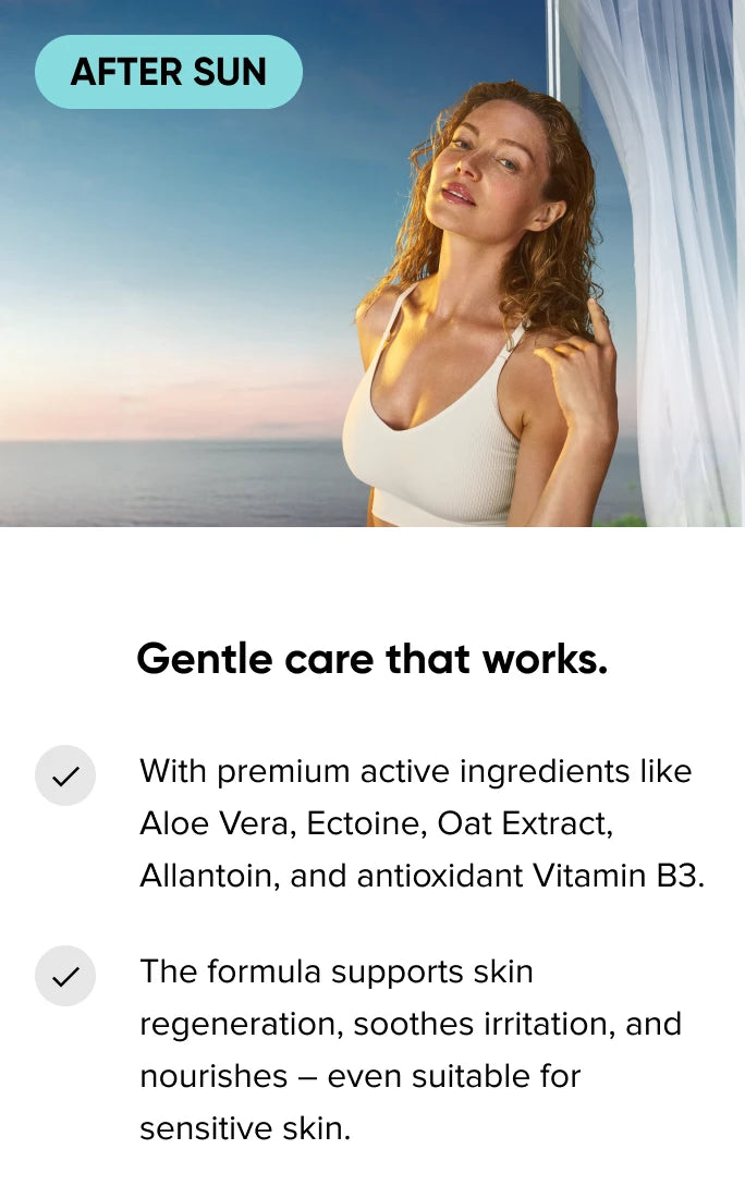 "After-sun products are a summer must-have as sun exposure, salt water and chlorinated water dry out the skin and disrupt the skin barrier. The result is dry, uneven skin and a quickly fading summer glow. This is why it is essential to use ingredients that strengthen and deeply hydrate the skin. Ectoin, aloe vera and niacinamide are particularly effective. Aloe Vera moisturises, soothes and cools the skin. Niacinamide strengthens the skin barrier, protects against UV damage and reduces redness. Ectoin stabilises cell membranes, protects proteins and has antioxidant properties - making it ideal for heat and sun stress."