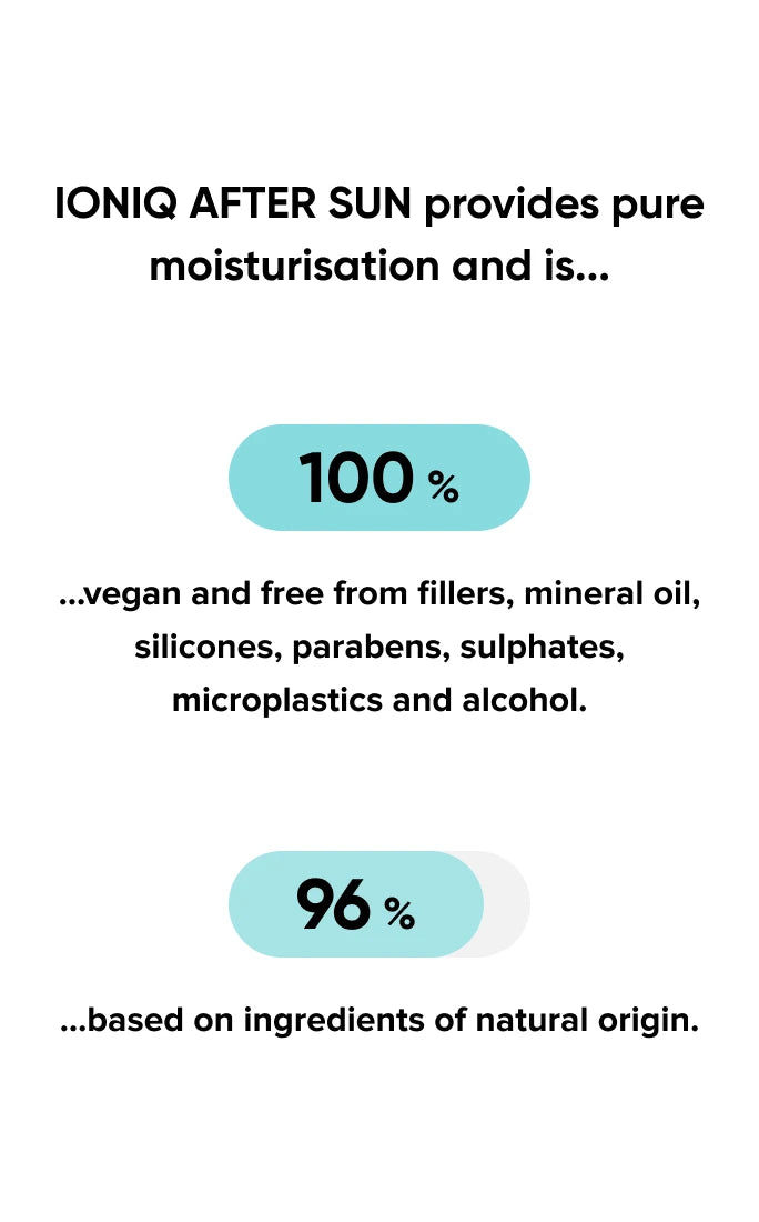 During the day, protect your skin with IONIQ SUN. In the evening, use IONIQ AFTER SUN to cool, calm, and intensely moisturise sun-exposed skin.