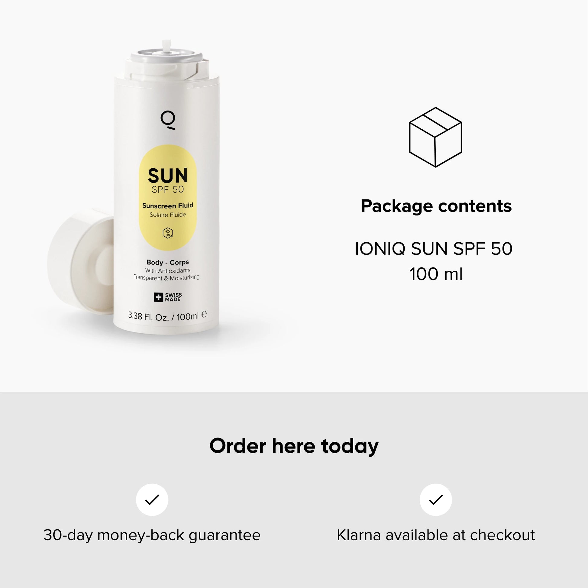 Our special formulation immediately protects the skin against UV rays, without the need to rub it in. That way, you are perfectly protected against the sun, and can even cover your back – all without getting sticky hands. Even sensitive skin types can use ourBODY Serumsafely. What’s more, theBODY Serumis vegan, cruelty-free and produced in Switzerland – like all our IONIQ Skincare products.