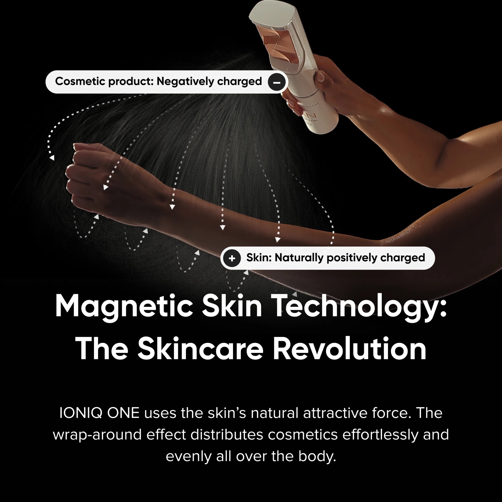 The sprayer is based on Magnetic Skin Technology. This creates a field of attraction between the skin and the skincare product so that almost every drop lands on the skin. The wrap-around effect enables homogeneous, complete and streak-free coverage of the skin, even in areas that are normally inaccessible, such as the back. Due to the precise and constant application dosage with IONIQ ONE, each cartridge consumes considerably less product than conventional sprays.