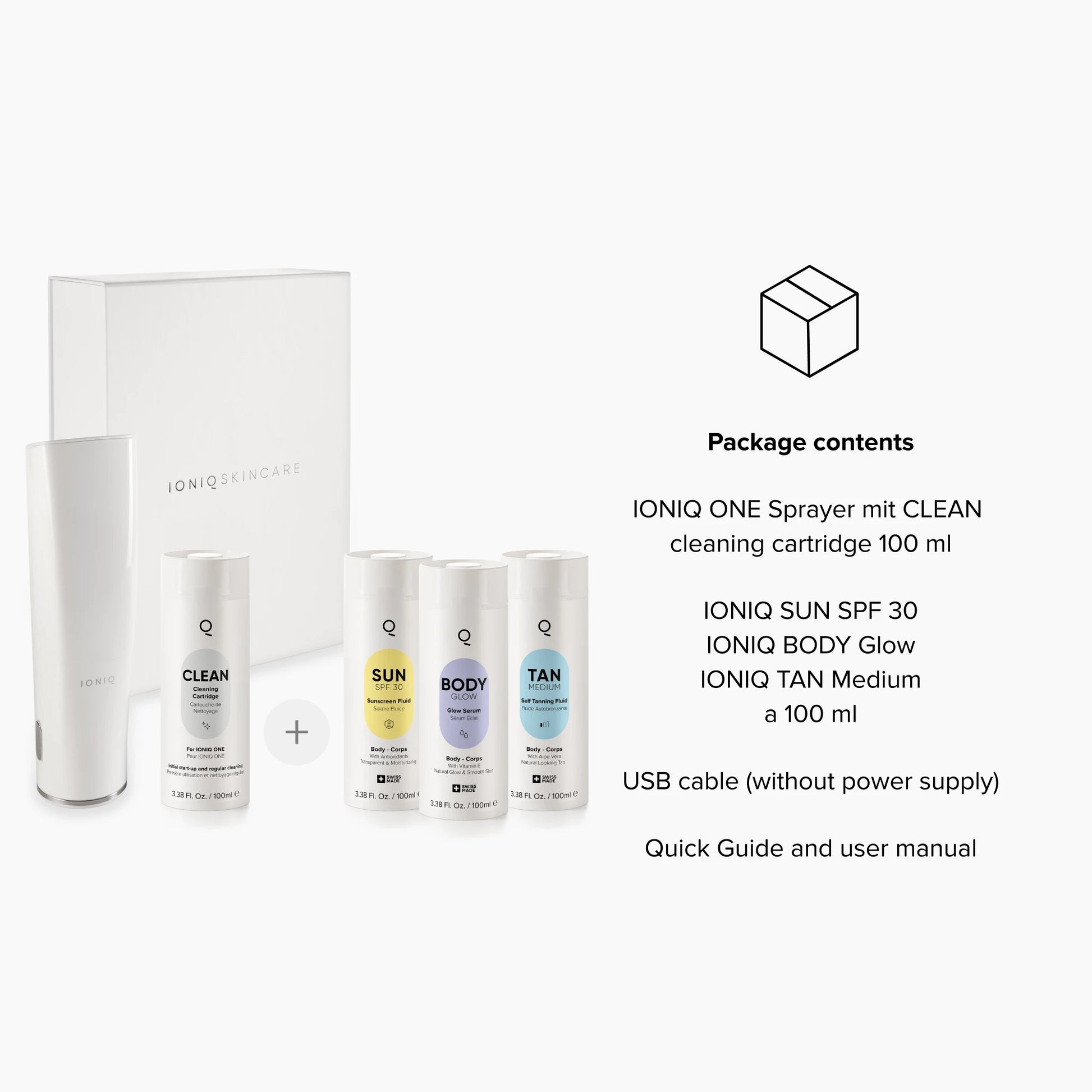 This exklusive collection, beautifully packed in a Design-Box, contains the IONIQ ONE Sprayer, one cartridge of BODY Glow, TAN Medium, SUN SPF 30 as well as the 100ml CLEAN Cartridge, a USB charging cable, Quick Guide and Operating Manual.