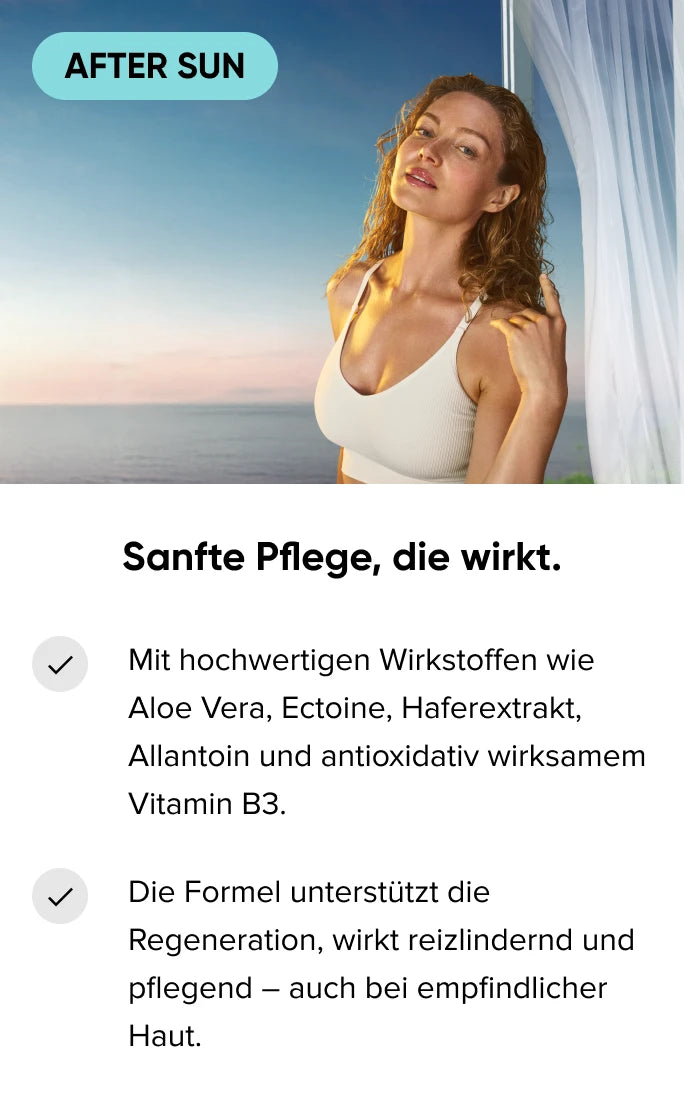 "After Sun Produkte sind im Sommer ein Must-Have, da Sonne, Salz- und Chlorwasser die Haut austrocknen und die Barriere stören. Die Folge: trockene, fleckige Haut und ein schnell verblassender Sommerglow. Wichtig sind daher Inhaltsstoffe, die die Haut stärken und intensiv Feuchtigkeit spenden. Besonders wirksam sind Ectoin, Aloe Vera und Niacinamid. Aloe Vera spendet Feuchtigkeit, beruhigt und kühlt. Niacinamid stärkt die Hautbarriere, schützt vor UV-Schäden und reduziert Rötungen. Ectoin stabilisiert Zellmembranen, schützt Proteine und wirkt antioxidativ – ideal bei Hitze und Sonnenstress."