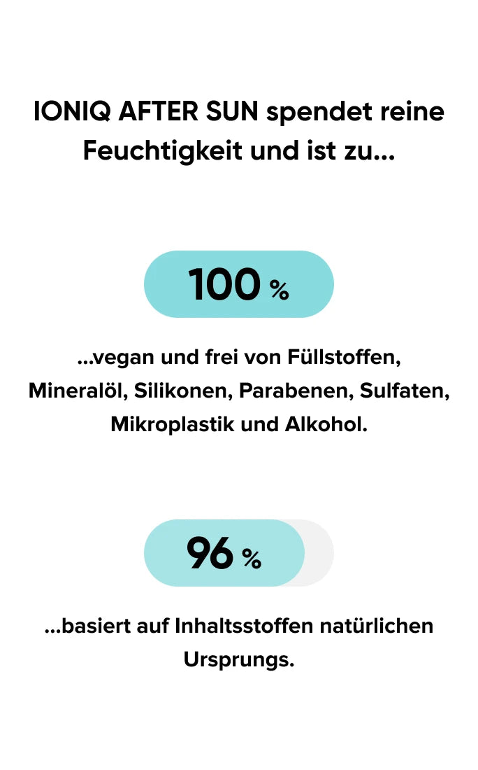 Tagsüber schützt du deine Haut mit IONIQ SUN vor der UV-Strahlung. Am Abend verwendest du IONIQ AFTER SUN, um sonnenverwöhnte Haut zu kühlen, beruhigen und intensiv mit Feuchtigkeit zu versorgen. Unser Tipp: Verwende IONIQ AFTER SUN auch bereits morgens nach dem Duschen – für einen Frischekick und erste Pflege, bevor du in den Tag startest.